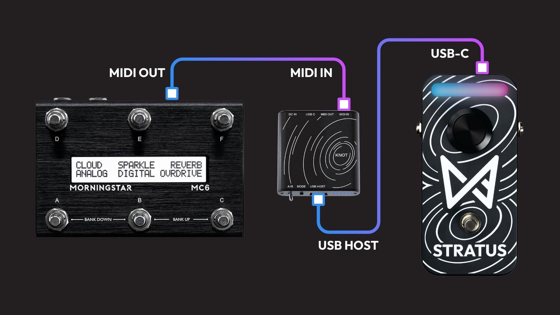 Power Knot with a USB-C cable or your guitar pedal power supply. With 6-12V universal polarity detection and power delivery to Stratus® over USB, the choice is yours.